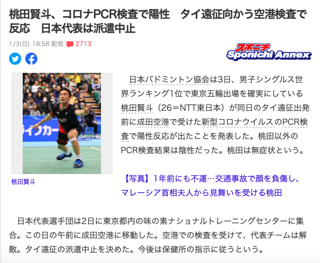 交通事故による右目付近の骨折が判明した バドミントン 日本代表の 桃田賢斗 について、所属先のntt東日本は28日、チームの練習に29日から復帰すると発表した。 27日に改めて目付近の診断をし、医師から復帰の許可が出たという。